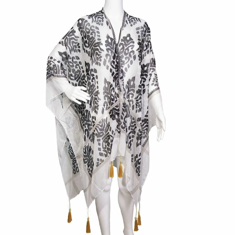 - Women’s polyester ruana wrap features black on white floral print with tassel accents.