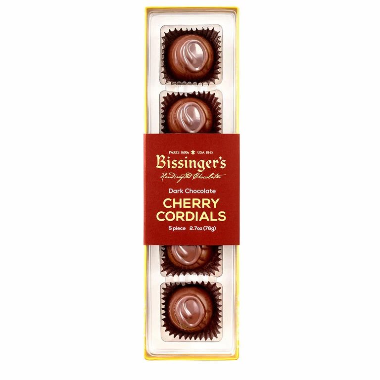 - Bissinger’s Chocolates dark chocolate cherry cordials box includes five pieces.