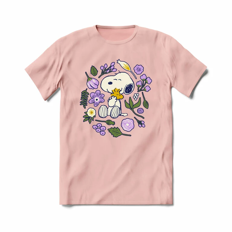 - Brief Insanity pink T-shirt features a fun floral design with Snoopy and Woodstock surrounded by flowers.