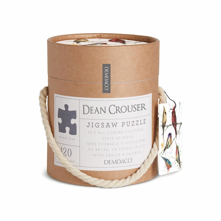 - Colorful birds puzzle from the Dean Crouser Collection by Demdaco includes 120 interlocking pieces in a sturdy storage canister.