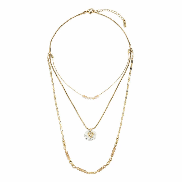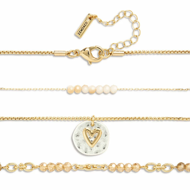 - Demdaco gold-toned layered necklace features glass beads, gemstones and a metal charm with heart design.