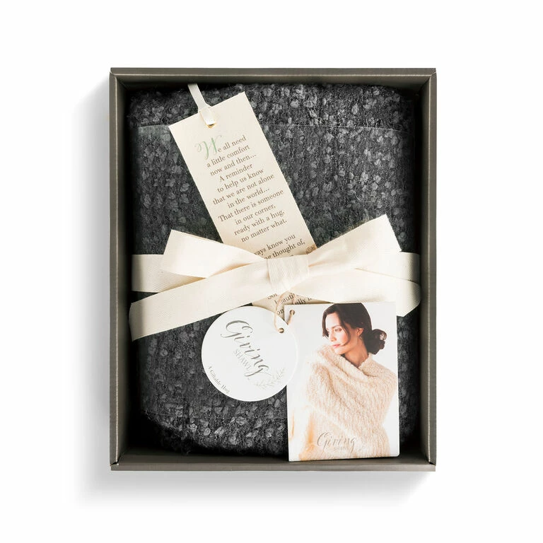 This sophisticated, cozy shawl is like a giftable hug designed to comfort a close friend or family member who may be walking through tough times or just needs to be reminded of how much they are loved. The Giving Shawl is a unique, artisan fashion accessory. This sumptuously soft wrap, made of nubby, charcoal-color nylon, features a small inside pocket perfect for holding a tissue, eyeglasses or cell phone. Comes hand-tied with satin ribbon and packaged in a beautiful gift box, with a bookmark featuring a message of encouragement.