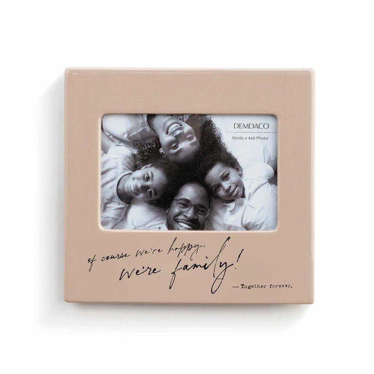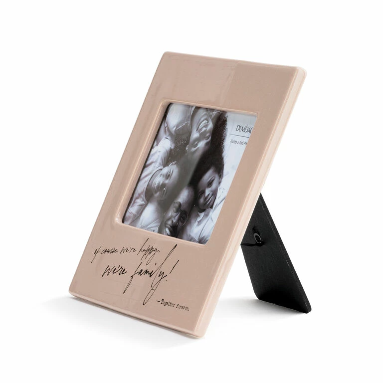 Show off your parenting (and reasoning) skills along with the proof—a happy fam photo—with this taupe ceramic picture frame featuring black script writing on a glazed finish. Photo frame holds a horizontal 4×6 photo. Stand it on a desk, table or shelf with the easel back or hang it on the wall with the triangle hanger. This charming photo holder is perfect for a Valentine’s Day, anniversary, birthday or anytime gift.