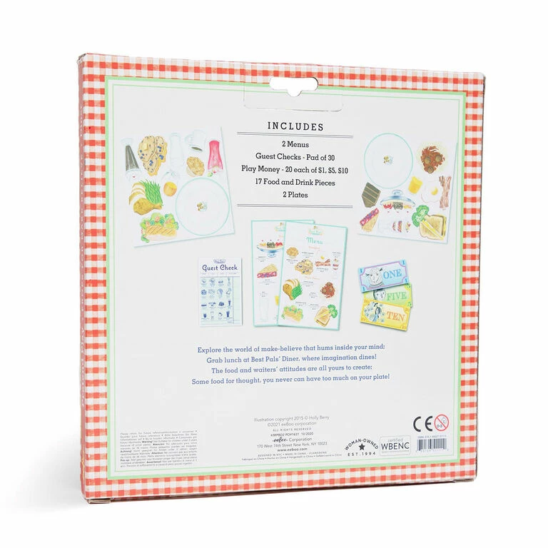 Cook up some fun for kids and promote creativity and interactive play with this Best Pals Diner Pretend Play Set. Whether they want to cook, take food orders or deliver the check, this set has everything they need to keep their entrepreneurial spirit going. A winner of the Oppenheim Platinum Award and artist illustrated by Holly Berry, this fun pretend play set will encourage little imaginations to soar!