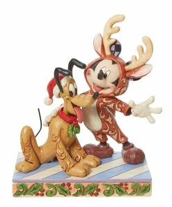 - High-quality stone resin figurine by Jim Shore features Mickey Mouse in a reindeer costume with Pluto in a Santa hat.