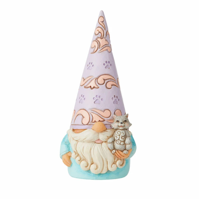 - High-quality stone resin Jim Shore figurine features a gnome in a paw print patterned hat holding a kitten.