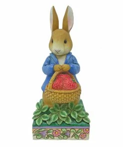 - High-quality stone resin figurine by Jim Shore features Peter Rabbit with a basket of strawberries.