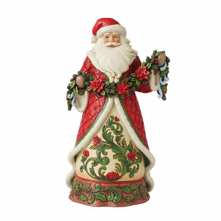 - High-quality stone resin Jim Shore figurine features Santa holding a poinsettia garland.