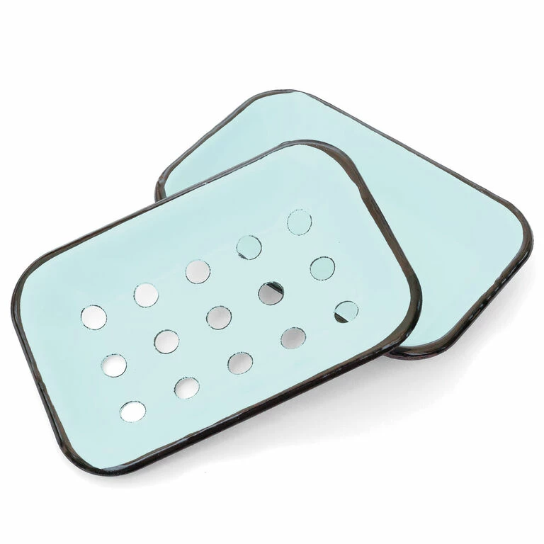 Decorate your kitchen and bathroom sinks in farmhouse style and functionality. This light blue enameled metal soap dish features holes that allow water to drain to the removable tray below making soap last longer. Pair this farmhouse soap dish with a handcrafted, decadent bar soap for a luxurious, spa-like gift for a friend or loved one.