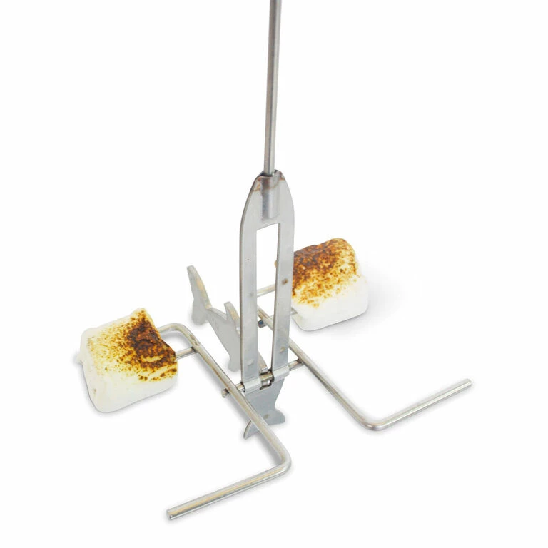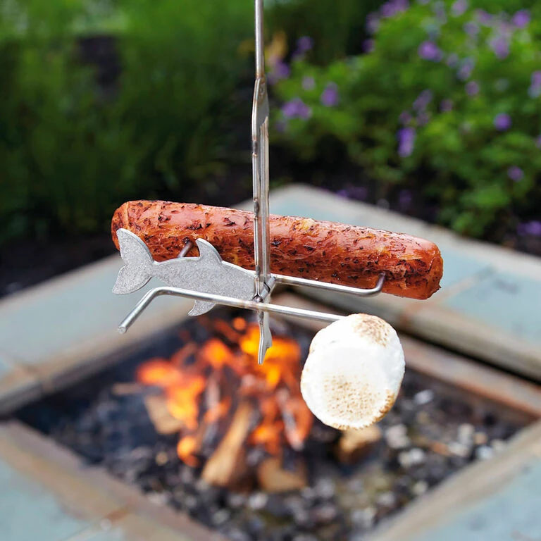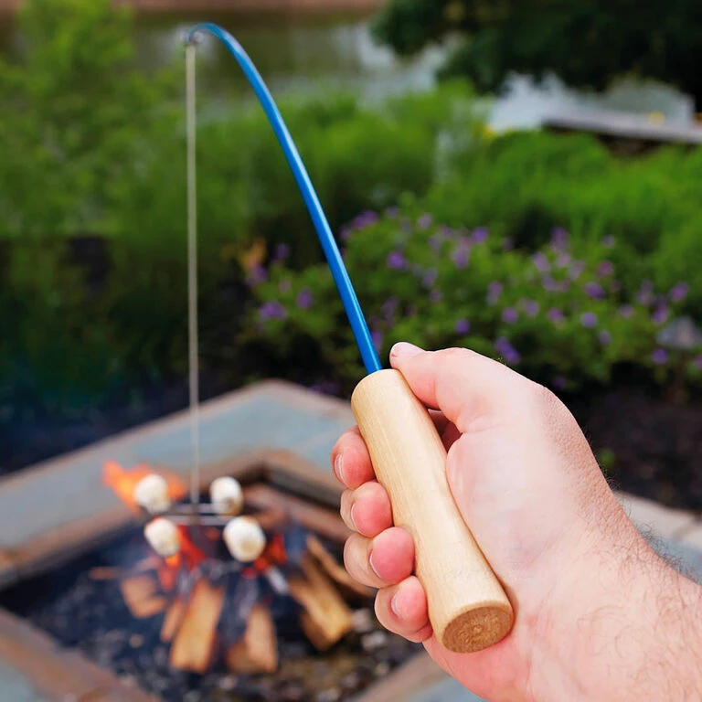- Fishing rod-inspired campfire roaster is made of stainless and powder coat steel with a wood handle.