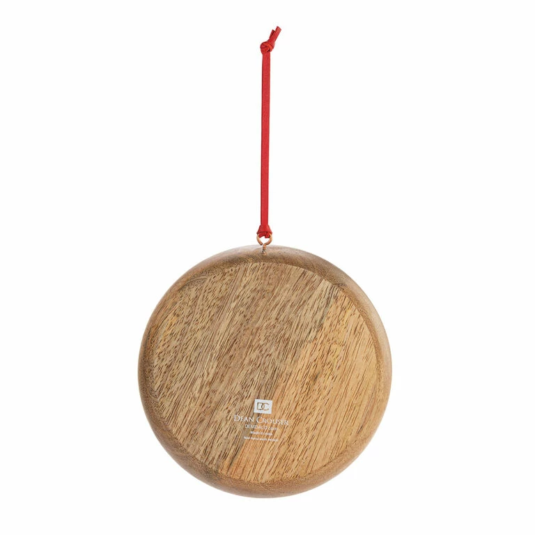- Round ceramic ornament features cardinals and bear in a distressed wood frame.