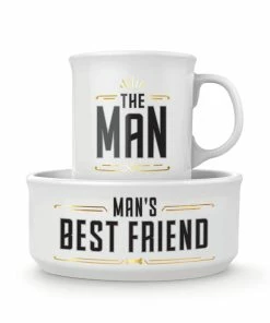 Enjoy breakfast or an afternoon coffee break with your fur baby with this clever matching mug and bowl. Kitchen gift set features a stoneware 16-ounce mug for you and a coordinating food bowl for your dog! Each piece is made of high quality ceramic with metallic gold details. Packaged together in a box, this fun pet gift set makes a great gift for a dog dad.