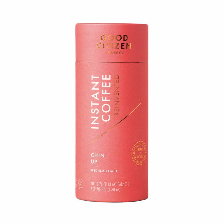 - Good Citizen Chin Up instant coffee canister includes 10 individual packets of medium roast coffee.