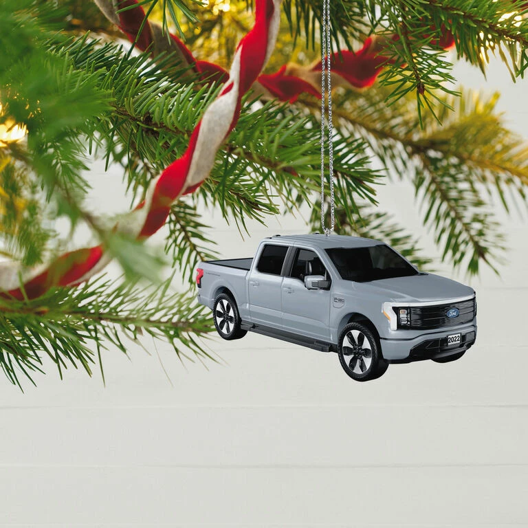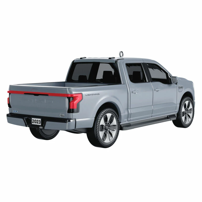 Undeniably built with a high-tech flair, the all-electric version of the popular Ford F-150 pickup truck zooms onto the Christmas tree. Ornament features a sporty silver look in die-cast metal with wheels that turn and a back license plate dated 2023.