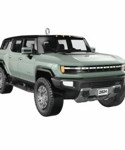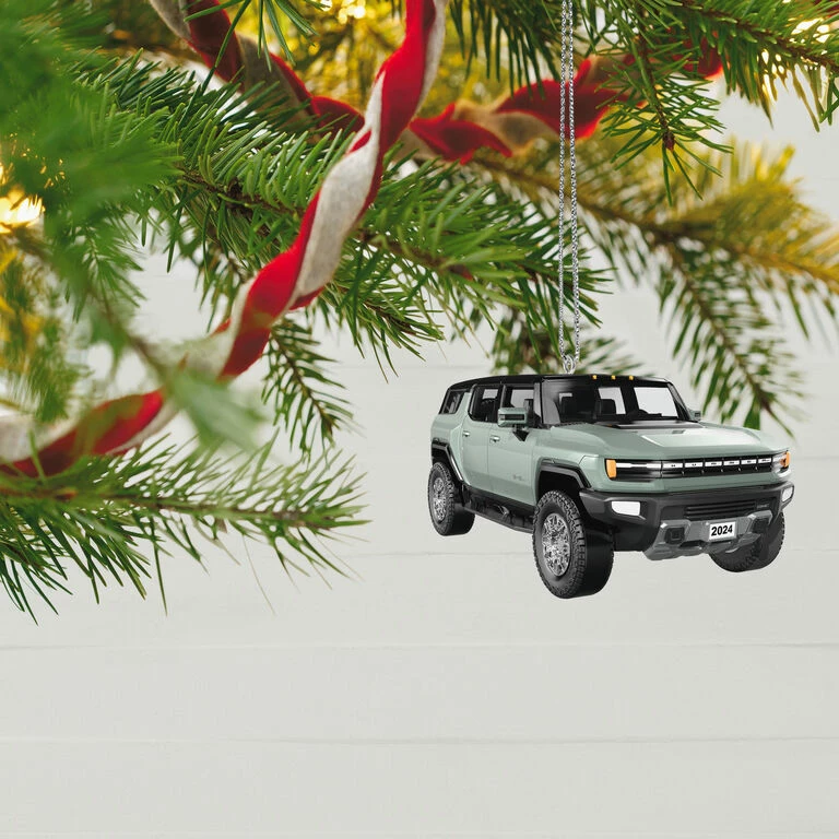 Hot off the production line and onto the Christmas tree comes this ornament featuring the 2024 all-electric model of the iconic Hummer sport utility vehicle. Combining many of the features of a pickup with the versatility of an SUV, this design in die-cast metal features a 2023 year date on its rear plate and wheels that turn.