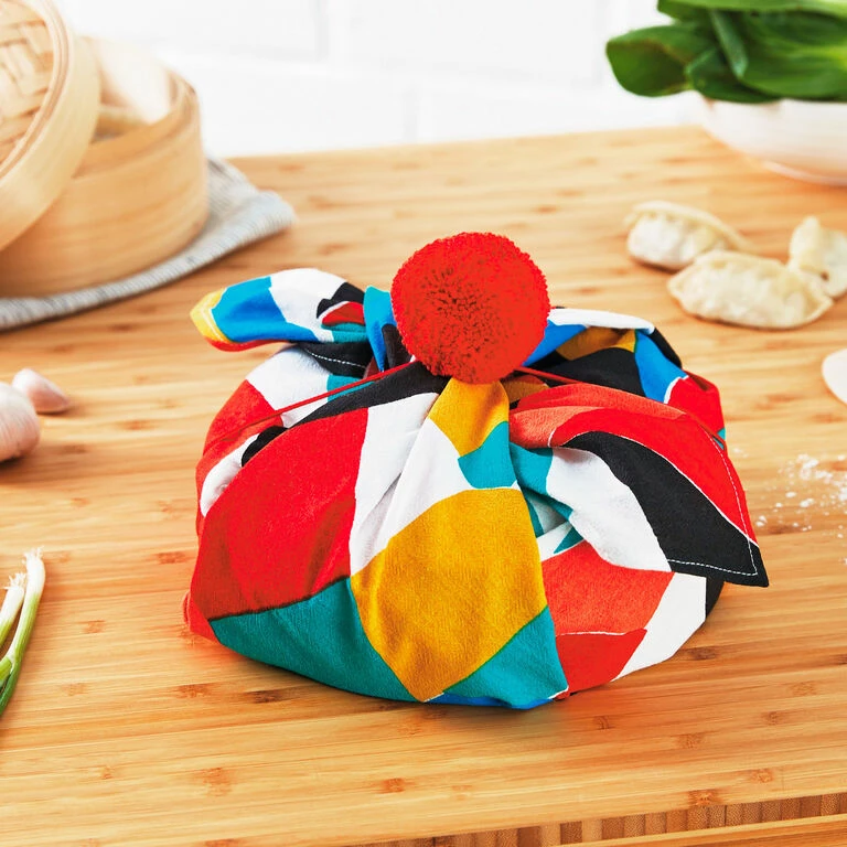 Share a stylish gift that keeps on giving with this colorfully designed wrapping cloth. Inspired by traditional Japanese furoshiki wrapping squares, this cloth wrap with a color block design is a great way to present a small gift to a friend or family member. The included pom-pom gift bow trim features a stretchy elastic band so you can secure the fabric around your gift with no tape or pins required. Hallmark fabric gift wrap is perfect to have on hand for all gift-wrapping occasions.