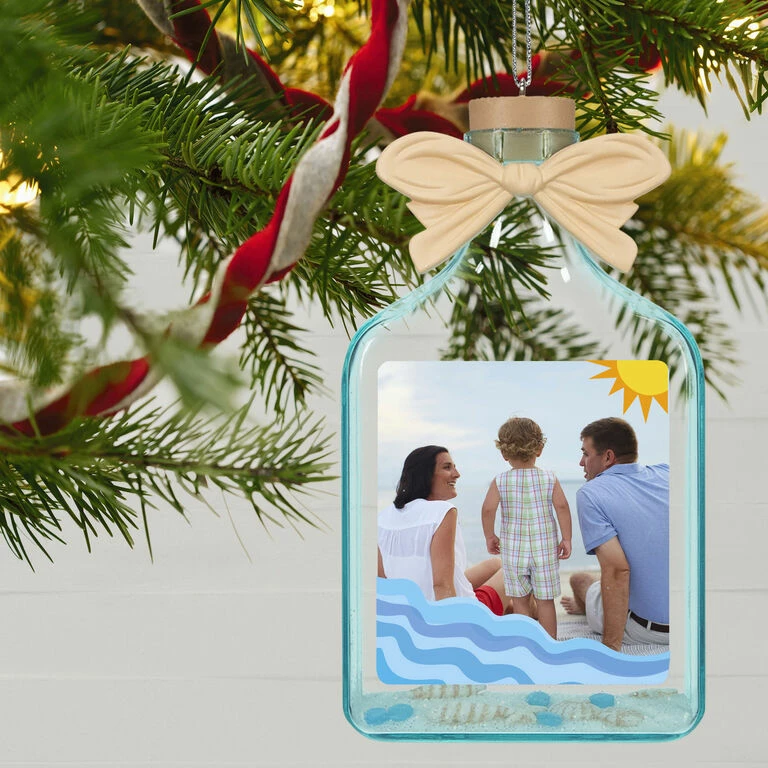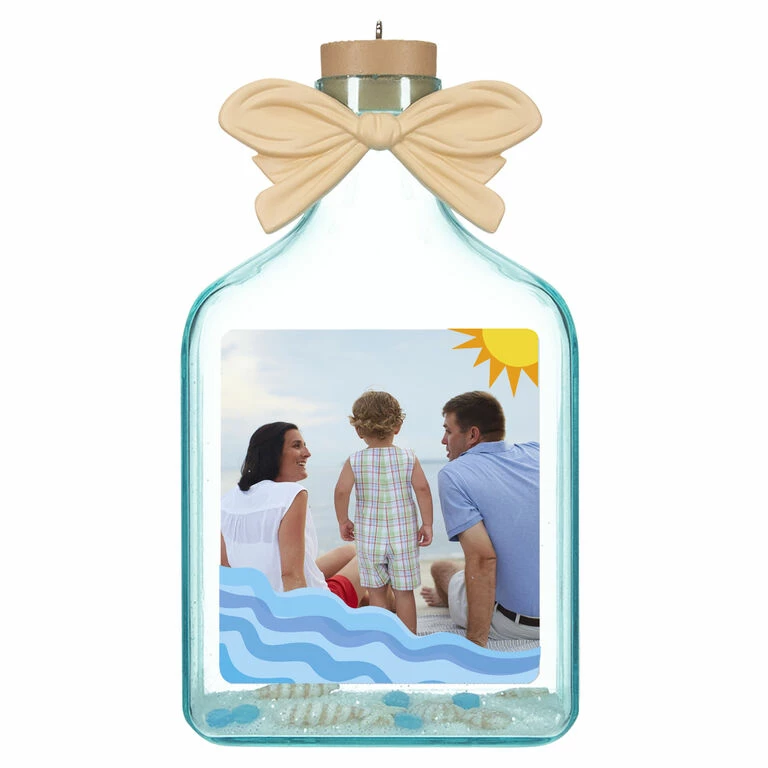 Remember a special beach vacation with this personalized Christmas tree ornament. The glass bottle design filled with seashells and sand and accented with waves and sun artwork makes a charming memento. Customize it with a photo from your trip.