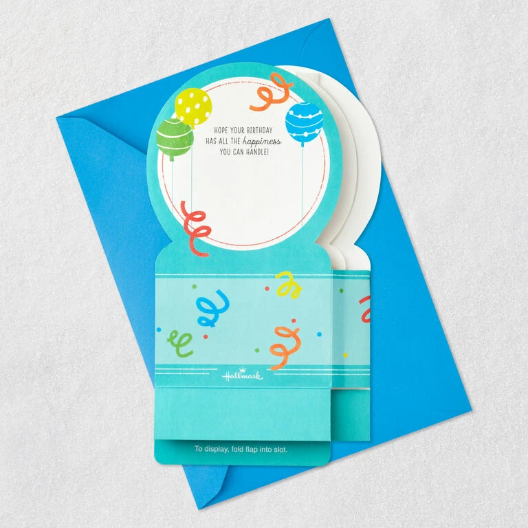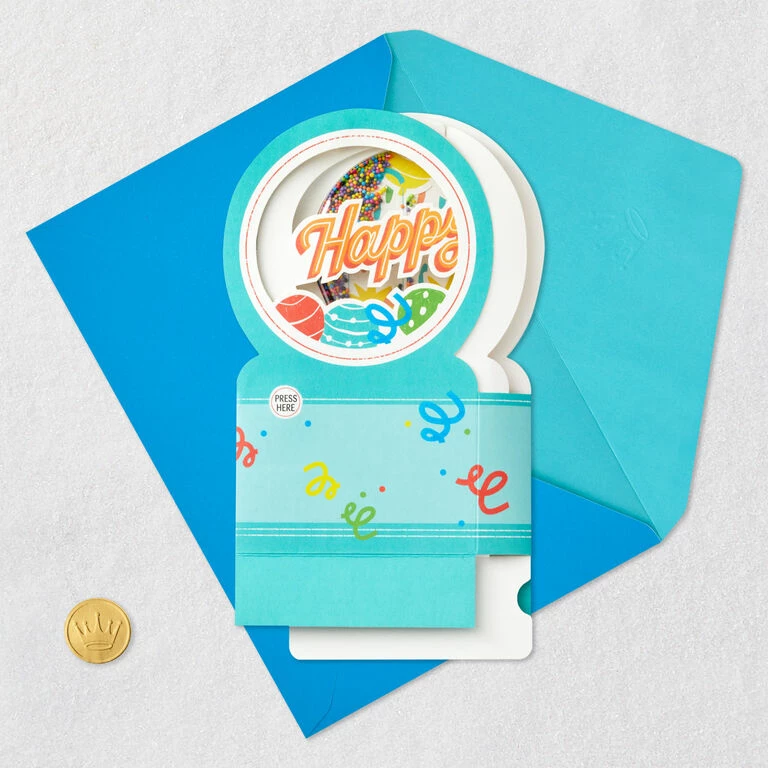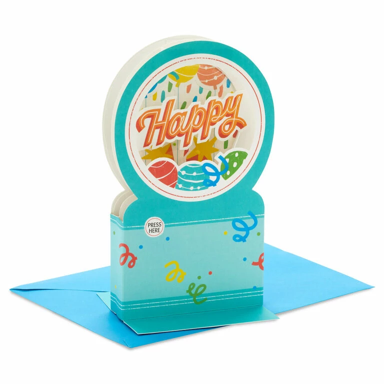 Pop-up birthday greeting card features a laser-cut, dimensional scene of colorful balloons and a “Happy” message inside of a 3D molded plastic snow globe-style design. Musical card plays a fun instrumental version of “Happy Birthday” while confetti blows inside when button on front is pressed. Simply unfold the card to create a fun surprise—no assembly required—that can be displayed on any tabletop. When open for display, 3D pop-up card measures approx. 7.25″ H.