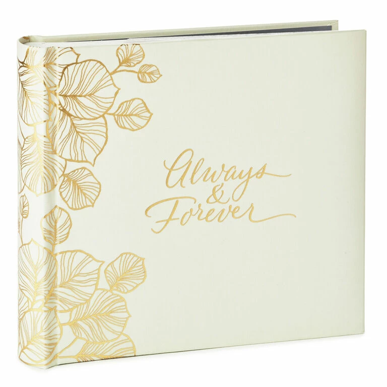 Keep memories of your wedding day secure in this beautifully designed photo album that features an elegant gold leaf design and “Always & Forever” in gold script on the cover. Reminisce when you look at 200 of your favorite pictures displayed in this lovely album.