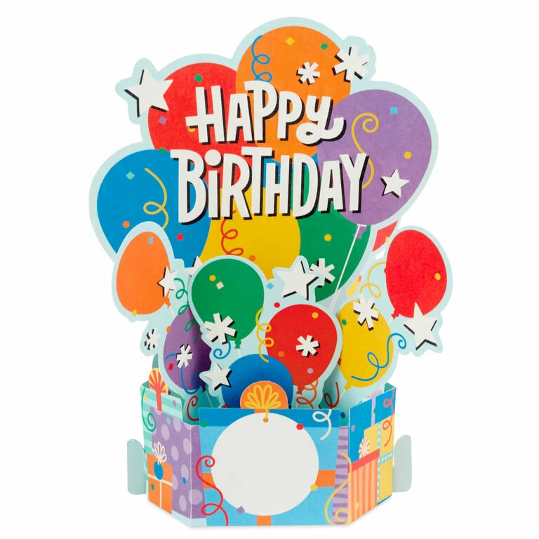 Pop-up birthday cards pack features a three-dimensional, laser-cut design of balloons, confetti and stars on a displayable base with cake and presents. Simply pull down on sides of cards and push up base to pop open and lock into place—no assembly required. Vibrant card with space on back for your personal message makes a fun birthday choice for friends, family members and kids.