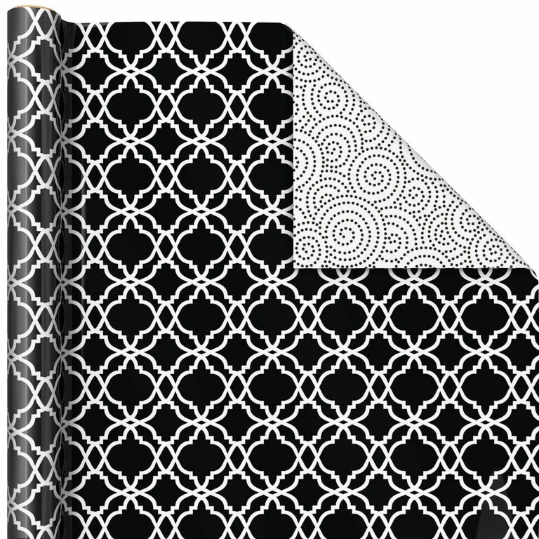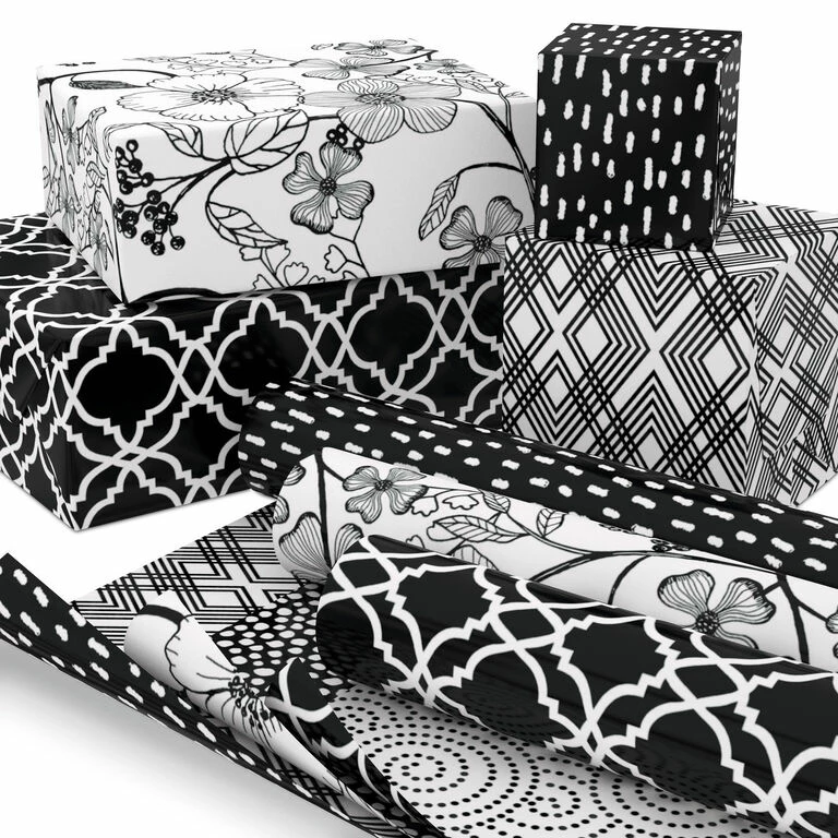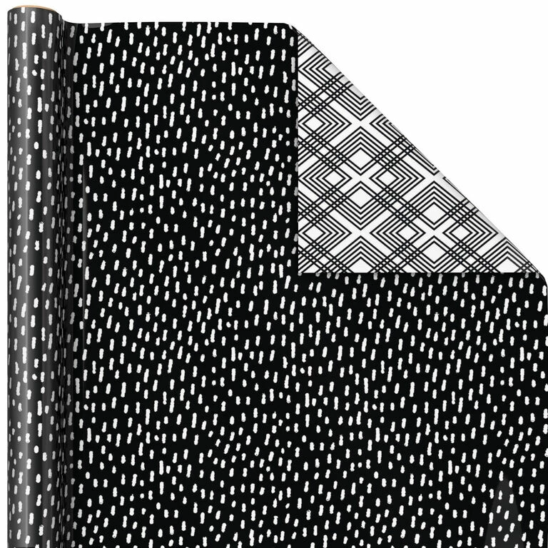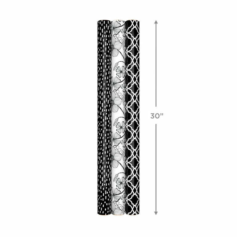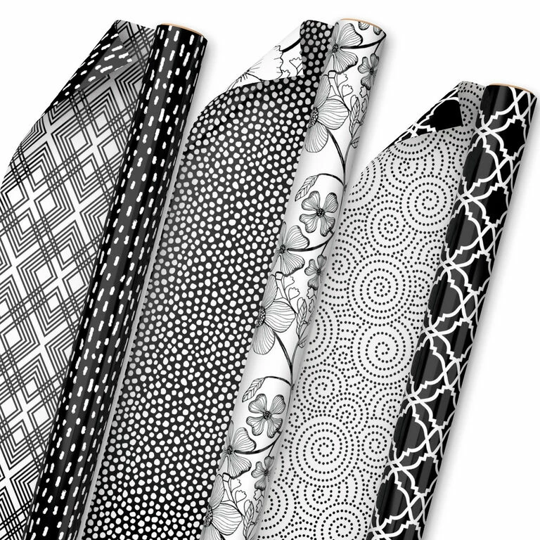 Add modern style to birthday gifts and more with this three-pack of reversible gift wrap. Three rolls of dual-sided wrapping paper means you have six patterns to choose from when wrapping your gifts. Each roll features coordinating black-and-white patterns for birthdays, weddings, graduations and more. Our reversible wrap doesn’t show through from one side to the other, so there’s no chance of sneaking a peek at what’s underneath.