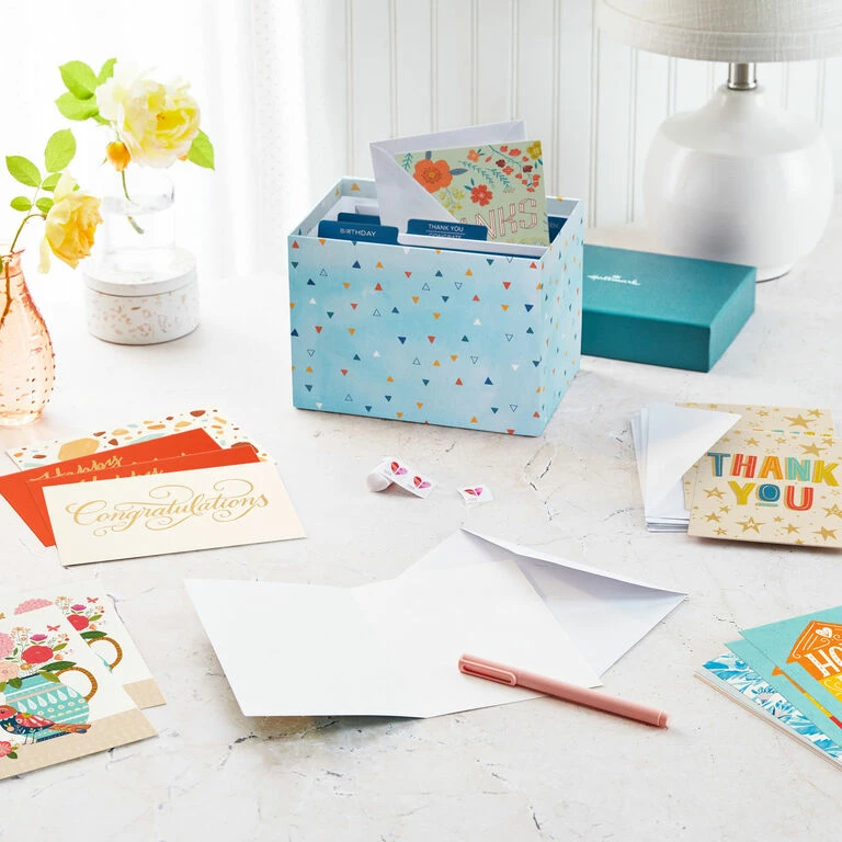 Don’t let special occasions catch you by surprise! With this bulk pack of assorted greeting cards on hand, you’re prepared to send birthday wishes, congratulations, get-well notes and more at a moment’s notice. All cards are blank inside for your own message. A designed storage box with removable lid and divider tab inserts keeps 100 high-quality Hallmark greeting cards and envelopes neatly organized. Convenient assortment includes 24 birthday cards, 4 new baby congratulations cards, 6 wedding/anniversary cards, 4 new home cards, 4 sympathy cards, 4 get-well cards, 10 encouragement/thinking-of-you cards, 2 just because cards, 6 congrats/celebrate cards, 10 thank-you cards, 8 Christmas cards, 2 New Year’s cards, 4 Valentine’s Day cards, 2 Mother’s Day cards, 2 Father’s Day cards, 2 graduation cards and 6 blank cards.
