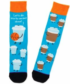 Show off a quirky sense of humor and a passion for coffee with these funky crew socks. Featuring a design of plain to-go coffee cups playing basketball against cups with drink holders and paired with a “shirts v. skins” message, these socks are guaranteed to generate some buzz. One size fits most adult-sized feet.