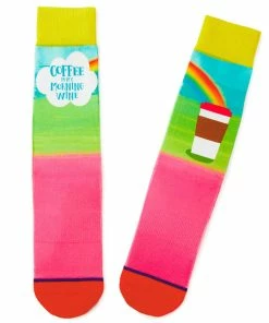 - Novelty crew socks feature a design of a rainbow and coffee cup and funny message.