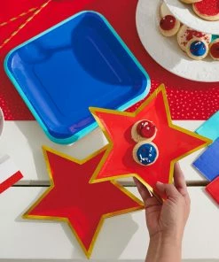 - 96-Piece Color Pop Basics Party Kit includes 12 each large square plates, small square plates and cups, all in warm ombré stripe; 12 each forks, knives and spoons in red; and 24 napkins in warm ombré stripe.