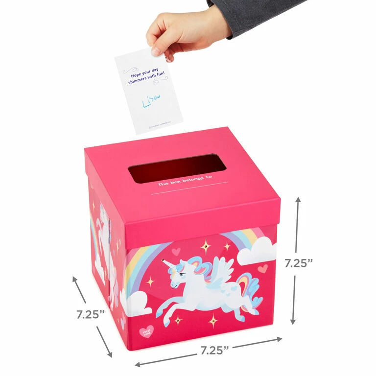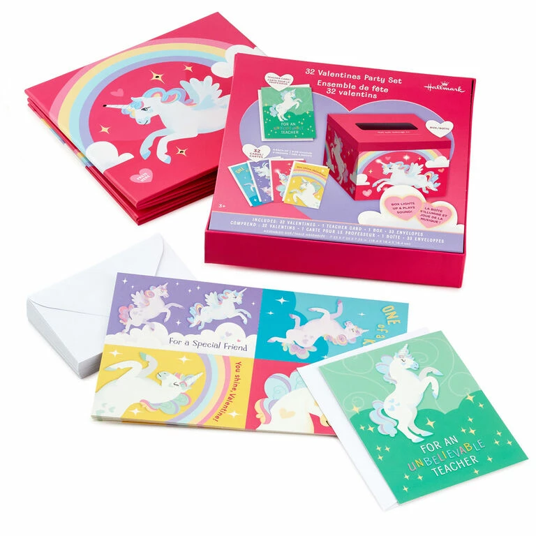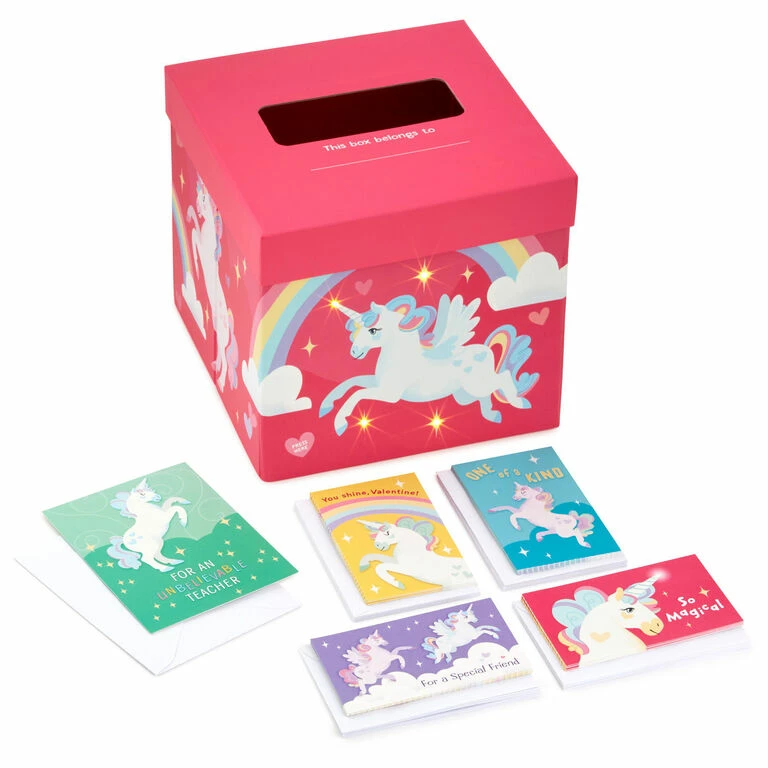 Valentine’s Day classroom card kit features 32 perforated/tear-apart classroom valentines (8 each of 4 colorful unicorn designs), 1 coordinating valentine mailbox with lid (simple assembly required) and 1 teacher Valentine’s Day card. For added fun, press button on the pink, unicorn-decorated classroom exchange mailbox to see lights sparkle and hear music play! This convenient, all-in-one kit offers a stress-free Valentine’s Day solution for classroom sharing, making it easy to exchange valentines with the whole class (including the teacher!).