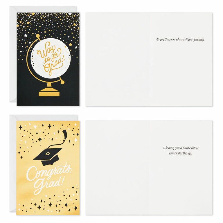 Graduation greeting cards assortment features six different designs with gold foil accents. Stock up with this multipack of grad cards with mortarboards, confetti and bold lettering designs that celebrate all the graduates. This pack of cards is perfect for sharing congratulations and proud wishes with friends and family.