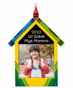 Celebrate a special academic year with this photo holder personalized Christmas tree ornament that’s perfect for displaying a school picture. The Crayola design features the iconic yellow box with colorful crayons forming the school house roof with space to customize by adding a name, date, grade or short message.