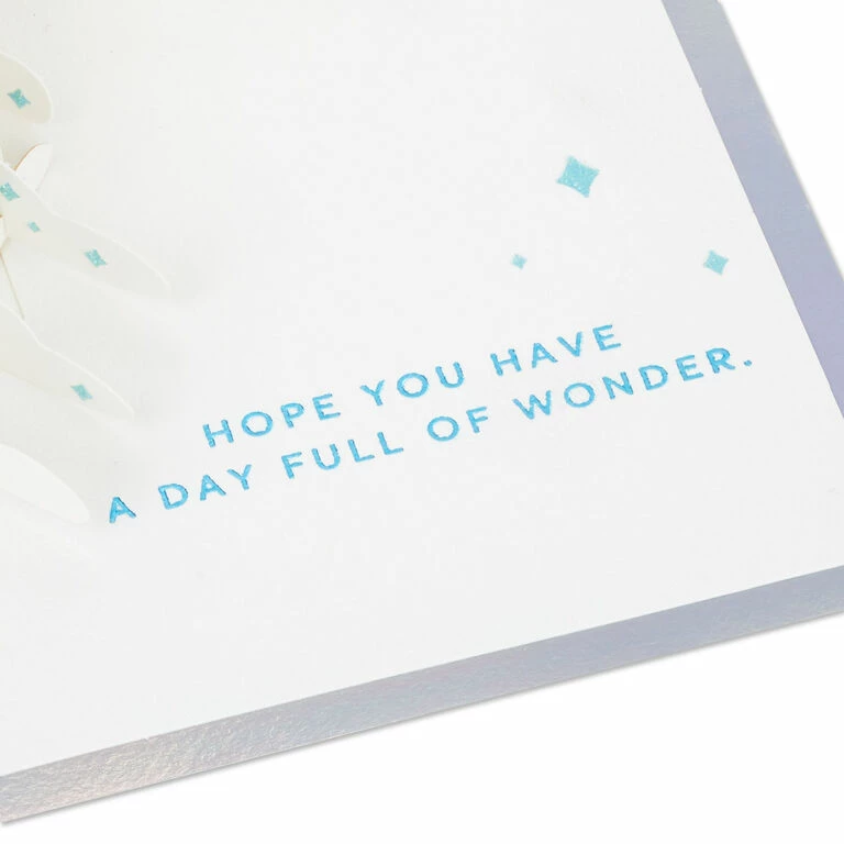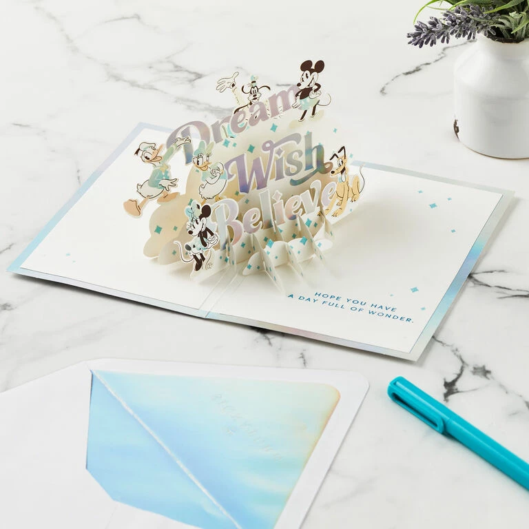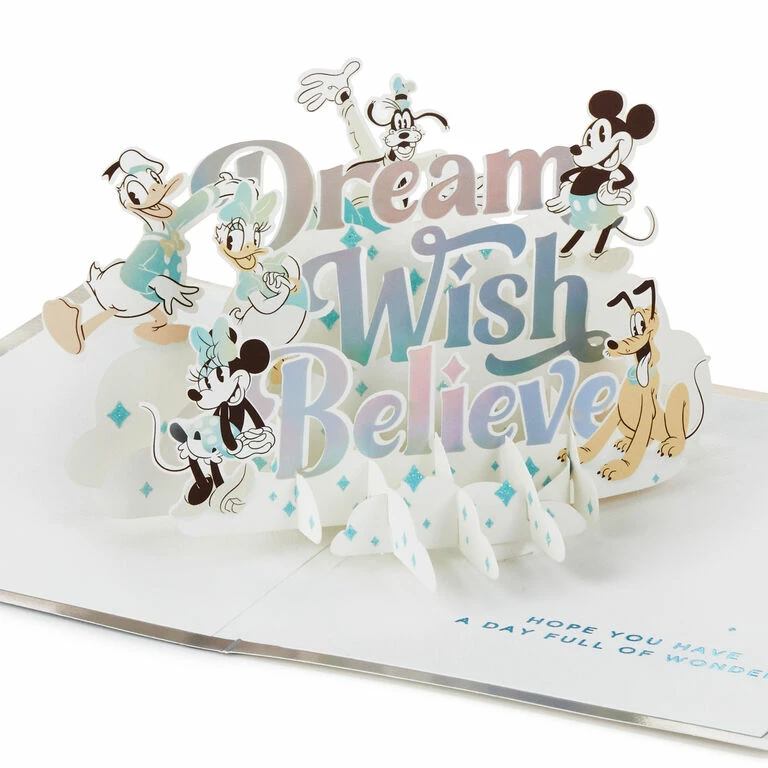 Pop-up greeting card features a light blue washed design and prismatic foil border on the front. Simply open the card to reveal the 3D pop-up surprise inside—no assembly required: Disney Mickey Mouse, Minnie Mouse, Goofy, Pluto, Donald Duck and Daisy Duck featuring a magical “Dream, Wish, Believe” message with stars pops out. Glitter and foil accents add a sparkly and shiny touch to this greeting designed in celebration of Disney’s 100th Anniversary. This exquisite card crafted from premium card stock is a work of art sure to be displayed all year long, making it an unforgettable way to share a message of love with a special kid or Disney fan on their birthday, graduation or just because.