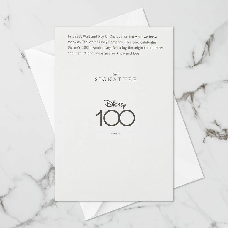 On back: In 1923, Walt and Roy O. Disney founded what we know today as The Walt Disney Company. This card celebrates Disney’s 100th Anniversary, featuring the original characters and inspirational messages we know and love.