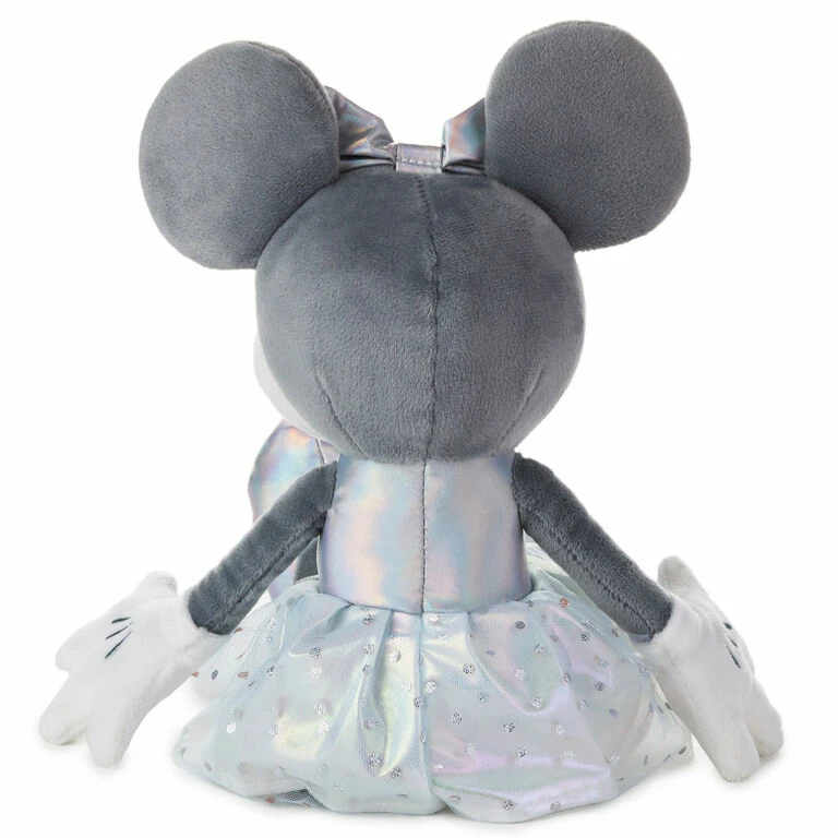 - Disney Minnie Mouse soft plush stuffed animal in platinum gray, white and iridescent fabrics features embroidered accents and a commemorative Disney 100th anniversary patch.