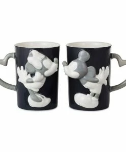 - Ceramic Mickey and Minnie ceramic mug set features raised kissyface designs and heart-shaped handles.
