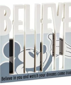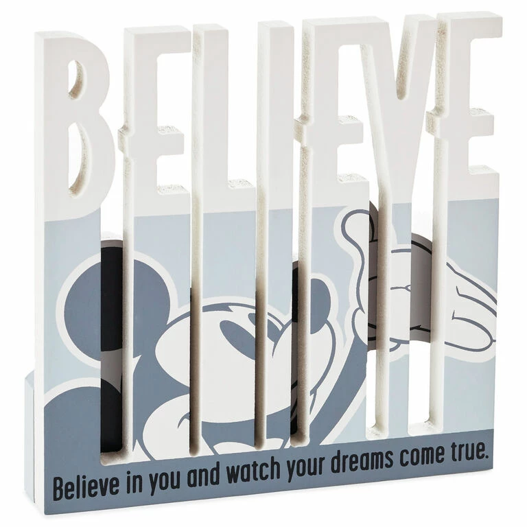 Encourage them to believe and aspire, with a little help from Mickey Mouse. Perfect for displaying on a bedroom or office shelf, this gray and white wooden Disney decoration features a dimensional, graphic design of Mickey Mouse with an inspiring quote. Makes a great gift for Disney fans of all ages.