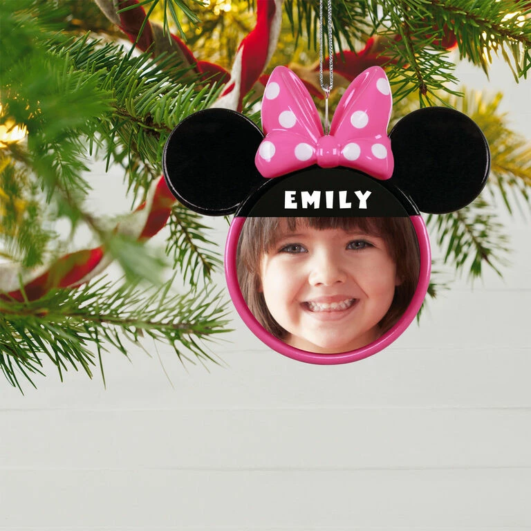 Let your love of Minnie shine through in your holiday decorating. This Minnie Mouse ears silhouette Christmas tree ornament can be customized with a name, date or short message and a photo—maybe from a special family vacation you had this year.