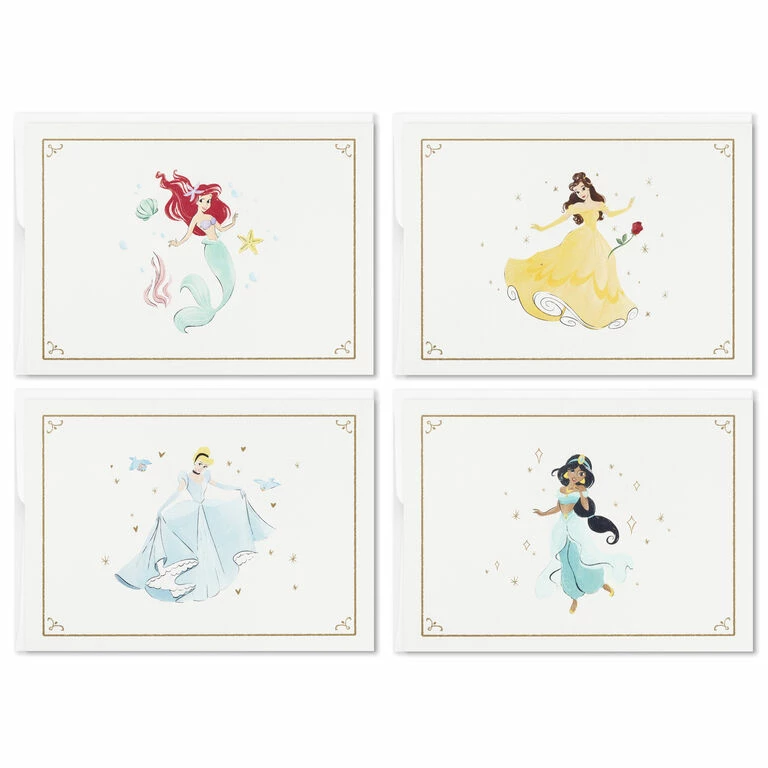 Blank note cards assortment pack feature four different Disney Princess designs including Ariel from “The Little Mermaid,” Jasmine from “Aladdin,” Belle from “Beauty and the Beast” and Cinderella with matte gold borders. Bulk pack of cards is perfect for sending happy birthday wishes, thank-you messages and more.