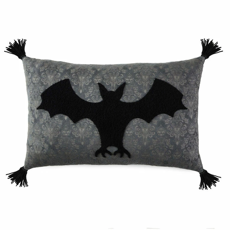 Add an eerie incandescence to your living space with this glow-in-the-dark throw pillow that features a chenille bat design over dark gray faux suede fabric with black tassels at each corner. When the lights go out, the pillow glows with a damask print of the Haunted Mansion wallpaper.