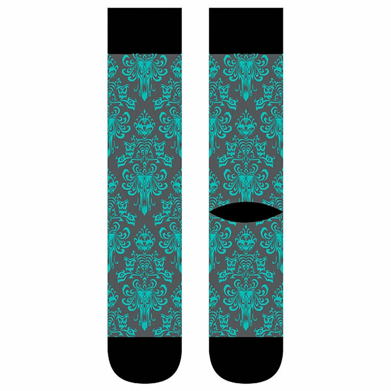 Wow friends, relatives and coworkers when a glimpse of your ankles reveals these black crew socks with the damask wallpaper design from the Haunted Mansion in a bold turquoise shade. Perfect for work or play, these socks make a hauntingly thoughtful gift for a friend, family member or fan of the Disney attraction.