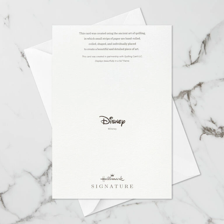 Greeting card features an intricate quilled paper design of Disney Princess Ariel from “The Little Mermaid.” Greeting is a work of art that displays beautifully in a 5×7 frame (sold separately), making it an unforgettable way to share wishes of dreams come true for a birthday, wedding and more. Crafted using the ancient art of quilling, in which small strips of paper are hand-rolled, coiled, shaped and individually placed to create a beautiful and detailed piece of art, this Hallmark Signature card was designed in collaboration with Quilling Card LLC, a company seeking to promote the art of paper quilling.