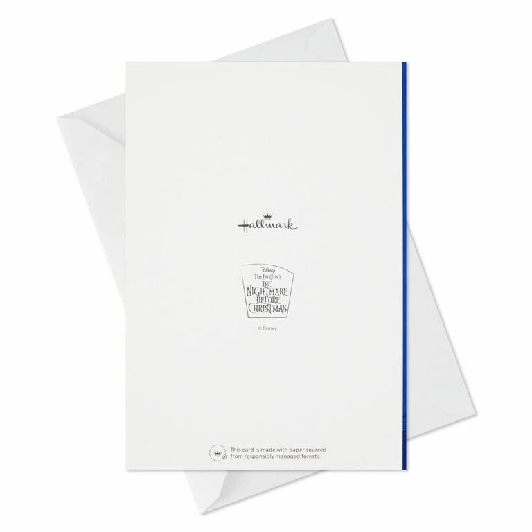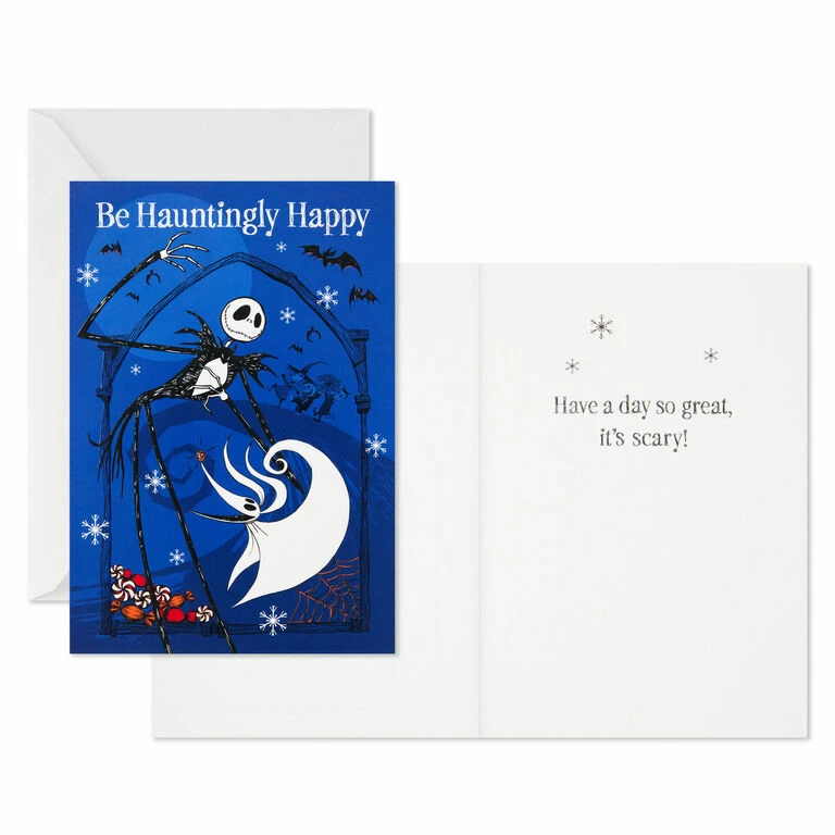 Boxed cards feature a fun design of Jack Skellington and his pet dog Zero on a blue background with bats flying overhead, Oogie Boogie’s henchmen in the background and a pile of hard candy in the corner of the graveyard gate. This pack of cards is perfect for sharing birthday, Halloween or holiday wishes with friends, family and fans of the Tim Burton classic.