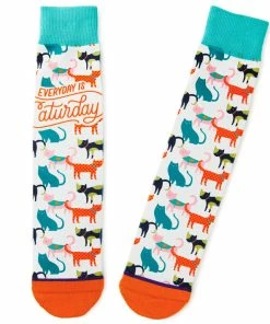 - Novelty crew socks feature cat illustrations paired with a punny message.