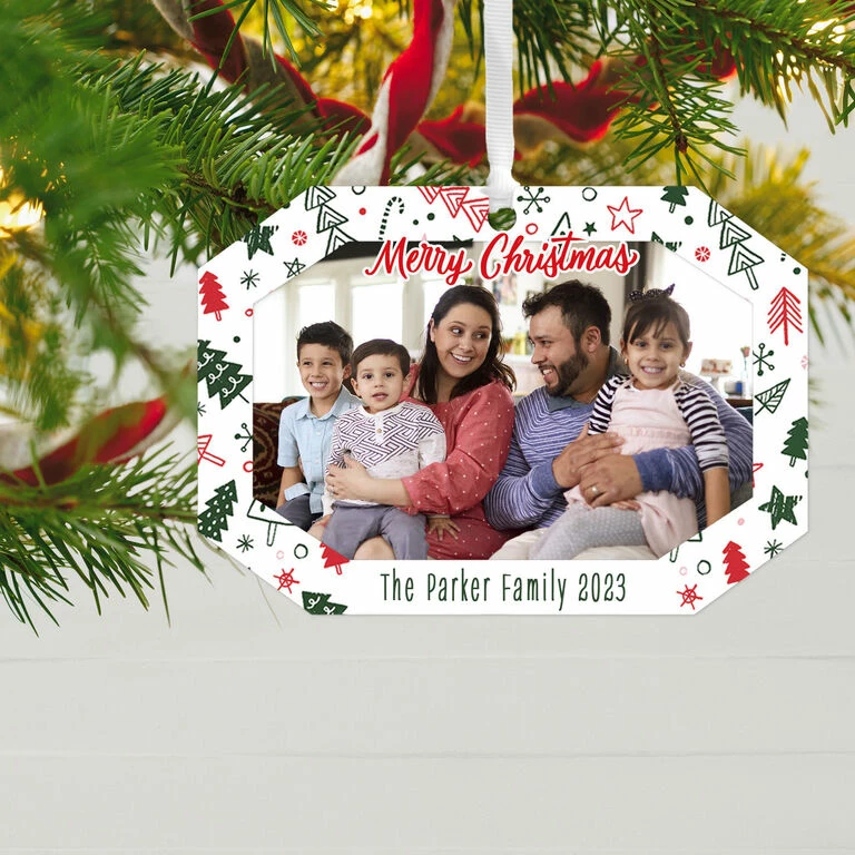 Show off a holiday memory or a family portrait to commemorate this year’s celebration with this personalized metal Christmas tree ornament. Choose a favorite photo to showcase with the festive pattern frame design, then customize it with a holiday greeting, the year and name, or a personal message.