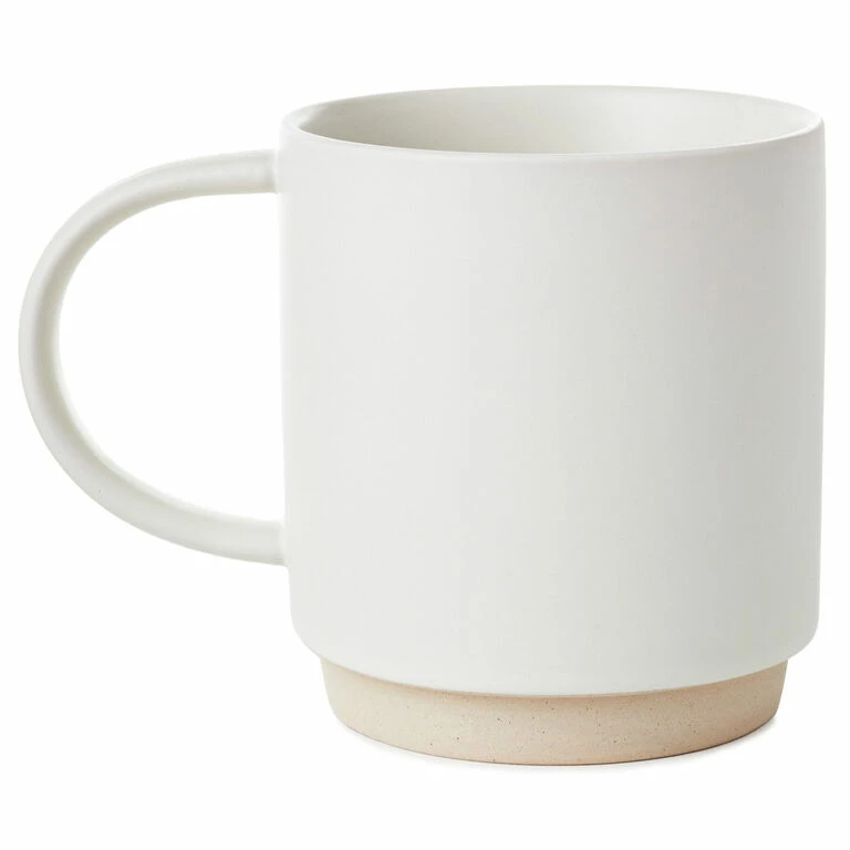 - White ceramic mug features a yoga instructor and a bagel design, an oversized handle and recessed bottom designed for stacking.