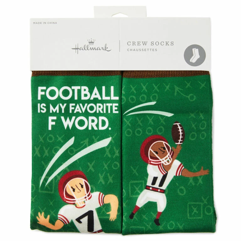 Display your favorite “F” word and love for the gridiron with these fun crew socks. Featuring football players, x and o play diagram designs and a humorous message, these green and brown socks make a great gift for a pigskin superfan. One size fits most adult-sized feet.