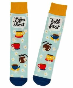 Speed through your day in Gilmore Girls style with lots of coffee and these cute socks on your feet. This pair of novelty crew socks features an iconic quote that provides a lifetime of inspiration in four caffeinated words. Fun light blue socks with coffee mug, coffee pot and daisy designs are sure to spur on your own fast-talking as you saunter through work and play.
