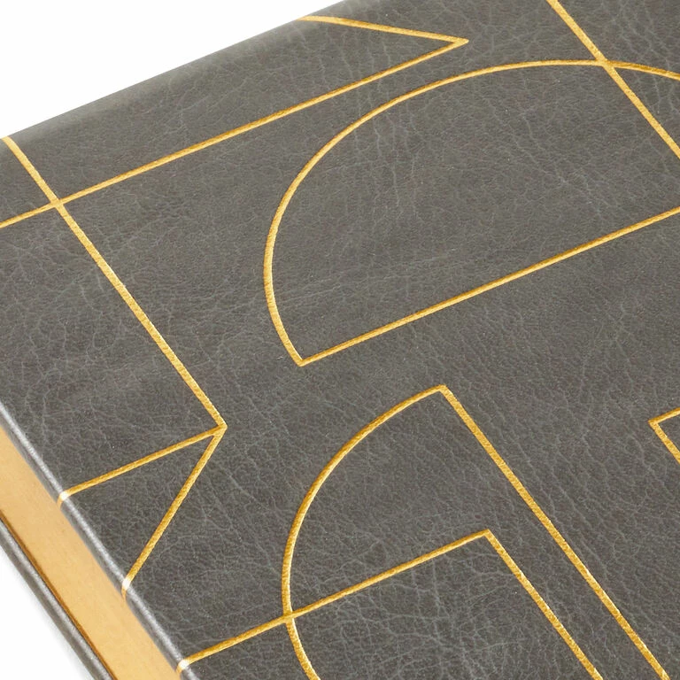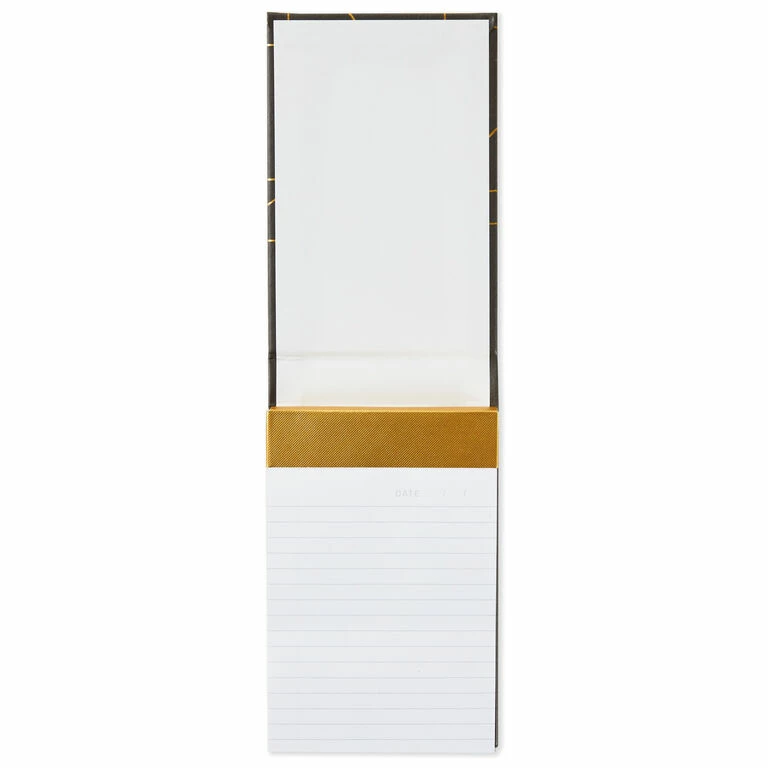 Be in the know when you jot memos on this little list pad. Memo pad sits in a gray faux leather case with geometric designs in gold foil. Pad of 150 lined and perforated sheets makes a noteworthy display on a desk or nightstand.