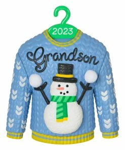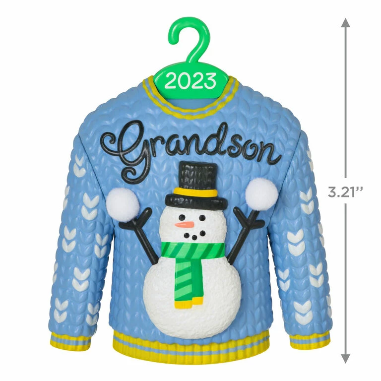 Your grandson will get a kick out of this Christmas tree ornament. The festive design features a blue and yellow sweater on a year-dated hanger with a cheerful snowman holding snowballs and “Grandson” decorating the sweater front.